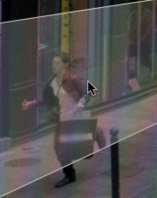 The virtual world ruthlessly fixed by an unconscious machine becomes an unexpected anthology of human scenarios: a couple who kisses romantically in the street, the surreal and unsettling silhouette of a passer-by wearing a sniper rifle, a cyclist caught in the tragicomic instant of a disastrous fall, the drama of a person collapsed on the ground (probable victim of a sudden illness), the suggestive image of an attractive young lady who peeks down at her plunging neckline.