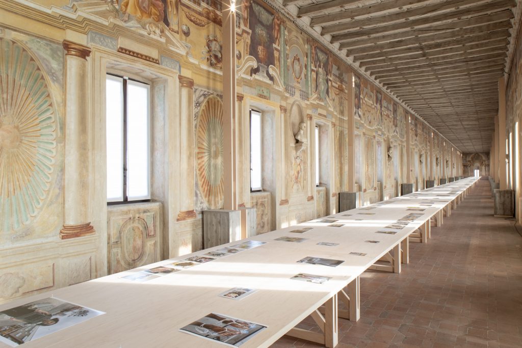 Un lunghissimo tavolo di legno grezzo con fotografie di moda e vita quotidiana fissate con spilli, senza alcuna cornice, nel Corridoio degli Antichi, lungo 97 metri, di Palazzo Giardino a Sabbioneta. Nella Sala degli Specchi immagini di grande formato al soffitto. Cosa sono queste istallazioni in una delle residenze più belle di Sabbioneta, la città rinascimentale, nata dal nulla, per il desiderio visionario di Vespasiano Gonzaga, oggi Patrimonio dell’Umanità?
